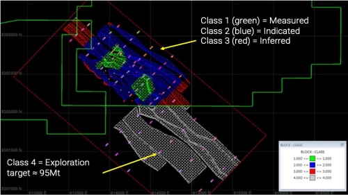 The gross Mineral Resource for Domain A is 145.2 Mt comprising 11.8 Mt in Measured, 55.4Mt in Indicated and 78.0Mt in Inferred (Table 1).